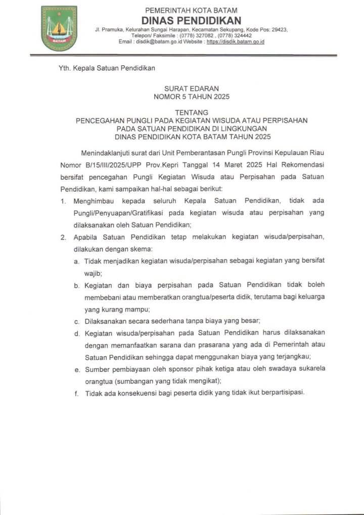 Larangan ini dituangkan dalam Surat Edaran Nomor 5 Tahun 2025 tentang Pencegahan Pungutan Liar (Pungli) pada Kegiatan Wisuda atau Perpisahan pada satuan pendidikan di lingkungan Dinas Pendidikan Kota Batam.