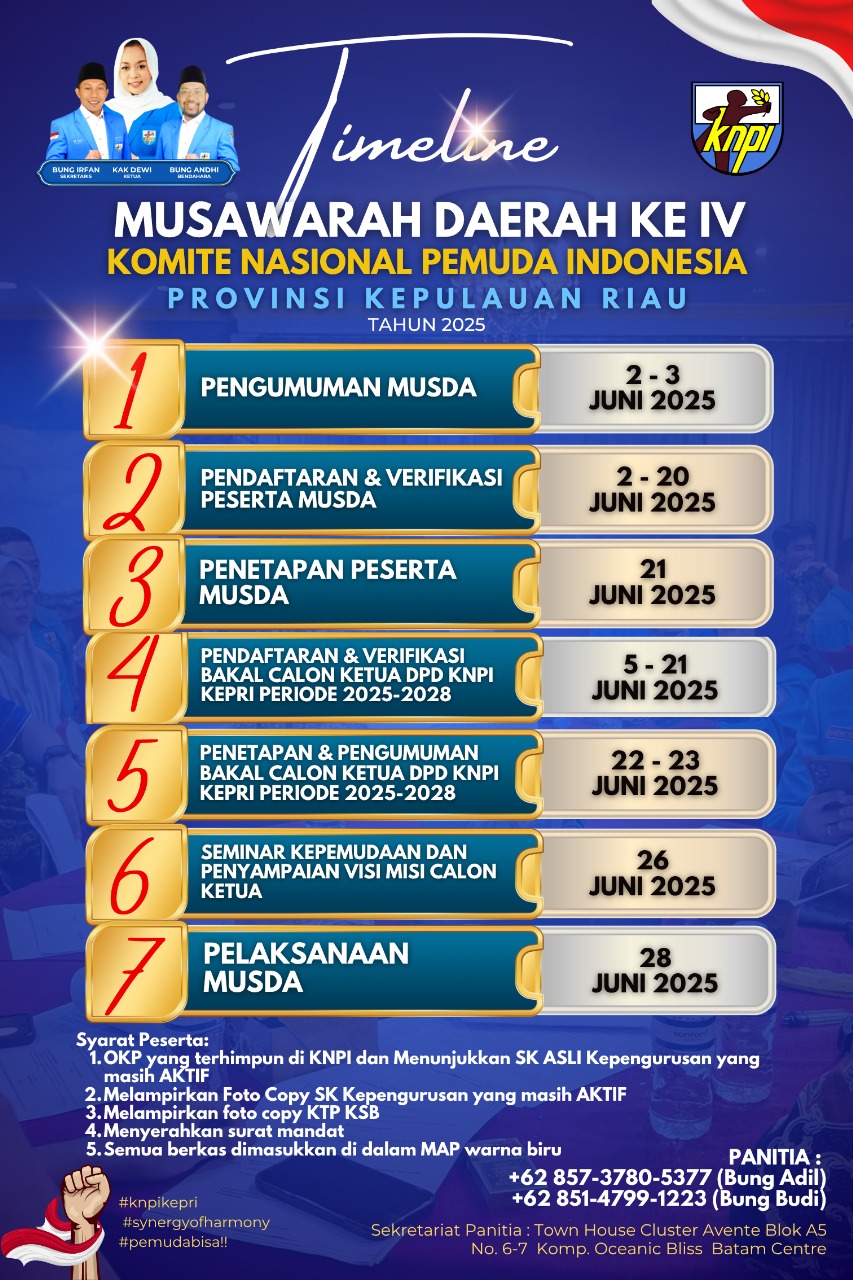 INIKEPRI.COM – Komite Nasional Pemuda Indonesia (KNPI) Provinsi Kepulauan Riau resmi mengumumkan pelaksanaan Musyawarah Daerah (Musda) IV, yang akan digelar pada 28 Juni 2025 mendatang.