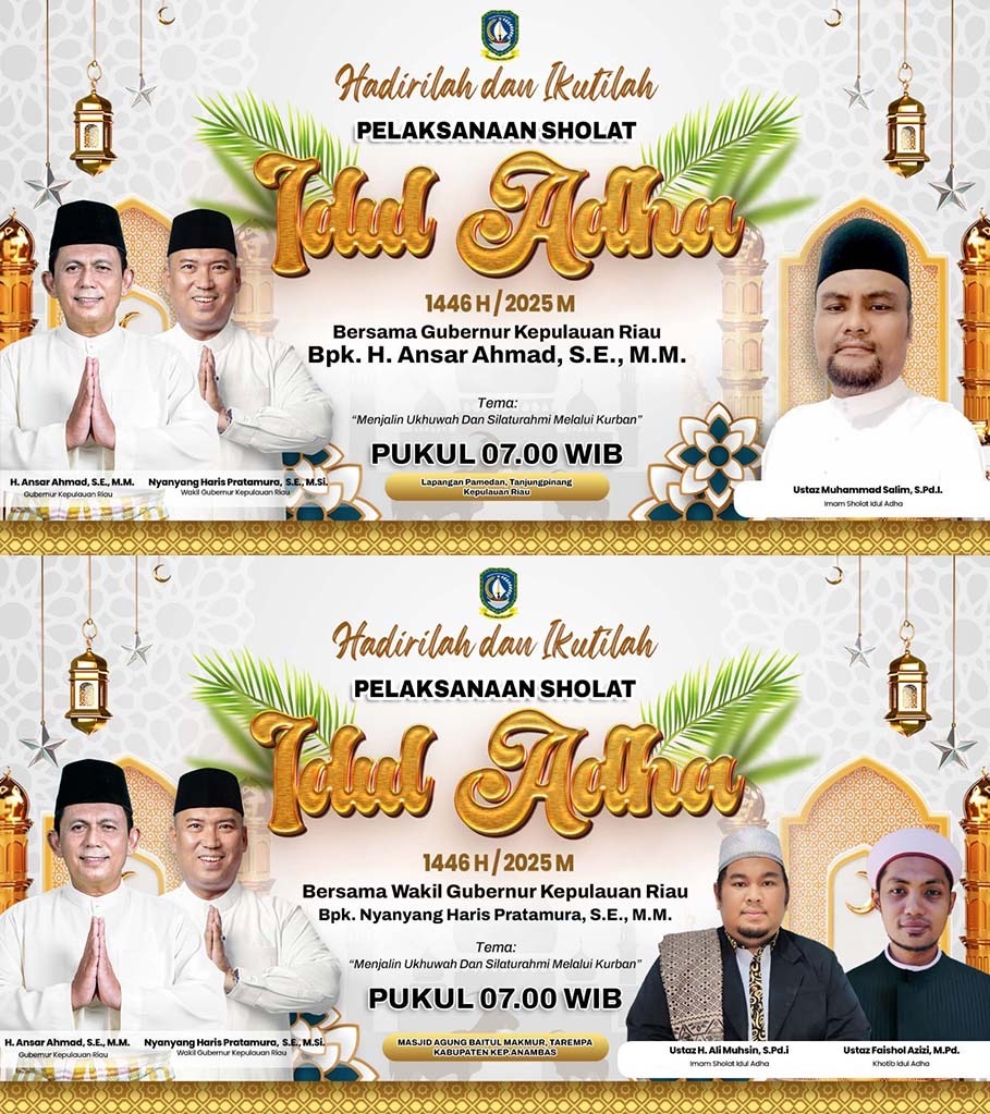 Dalam kesempatan ini Pemerintah Provinsi Kepulauan Riau mengajak seluruh masyarakat Kepri, khususnya yang berada di Kota Tanjungpinang dan Kabupaten Kepulauan Anambas untuk turut serta meramaikan shalat Idul Adha 1446 Hijriah/2025 Masehi ini.