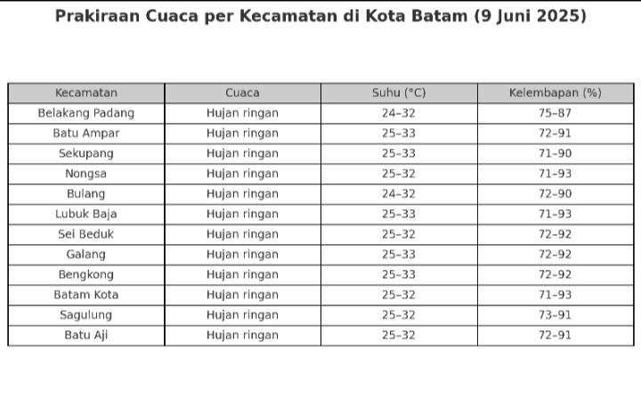 INIKEPRI.COM – Badan Meteorologi, Klimatologi, dan Geofisika (BMKG) memprakirakan Kota Batam akan mengalami hujan ringan di sebagian besar wilayahnya sepanjang hari ini, Senin (9/6/2025).