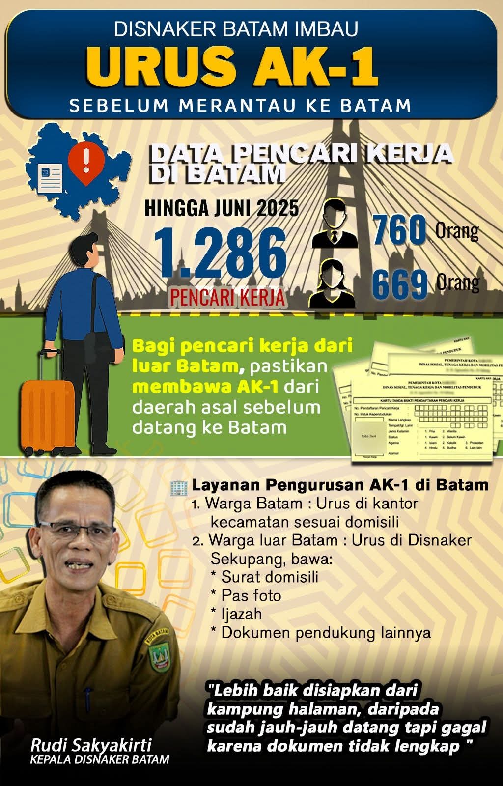 “Kalau datang ke Batam tanpa surat domisili, mereka tidak bisa urus AK-1 di sini. Maka dari itu, kami minta yang ber-KTP luar Batam untuk urus AK-1 di daerahnya terlebih dahulu,” ujar Rudi, Selasa (24/6/2025).
