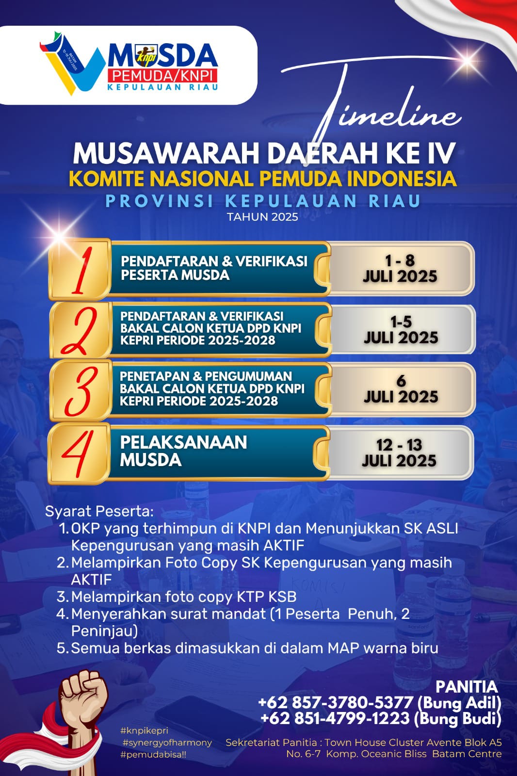 • 1–5 Juli 2025: Pendaftaran & verifikasi bakal calon Ketua DPD KNPI Kepri 2025–2028