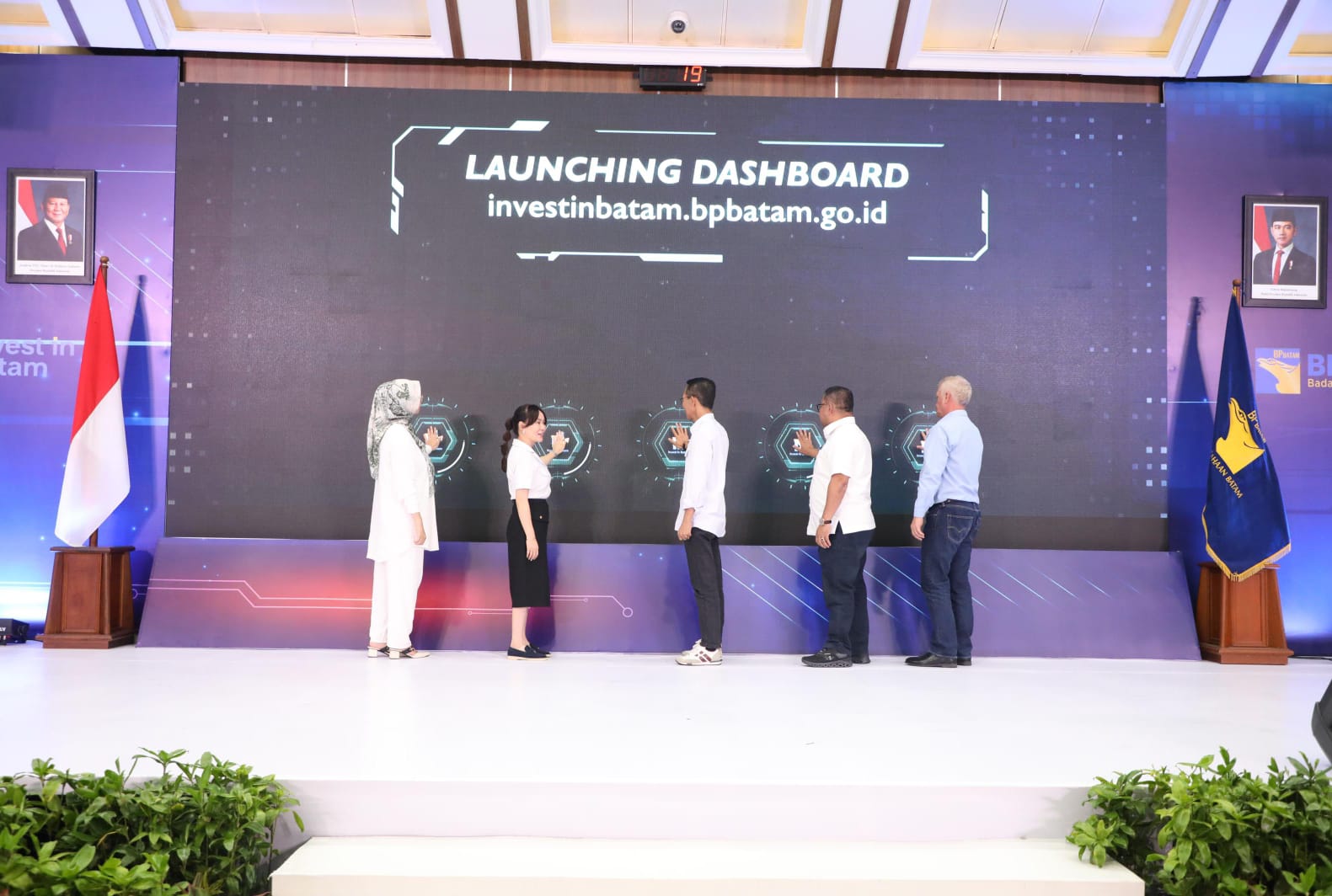 Kepala BP Batam Amsakar Achmad dan Wakil Kepala BP Batam Li Claudia Chandra didampingi Anggota/Deputi Bidang Investasi dan Pengusahaan Fary Francis secara simbolik menekan tombol virtual di layar sebagai tanda resmi telah diluncurkan Digital Dashboard Investasi sekaligus memperkenalkan para Duta Investasi Batam 2025.