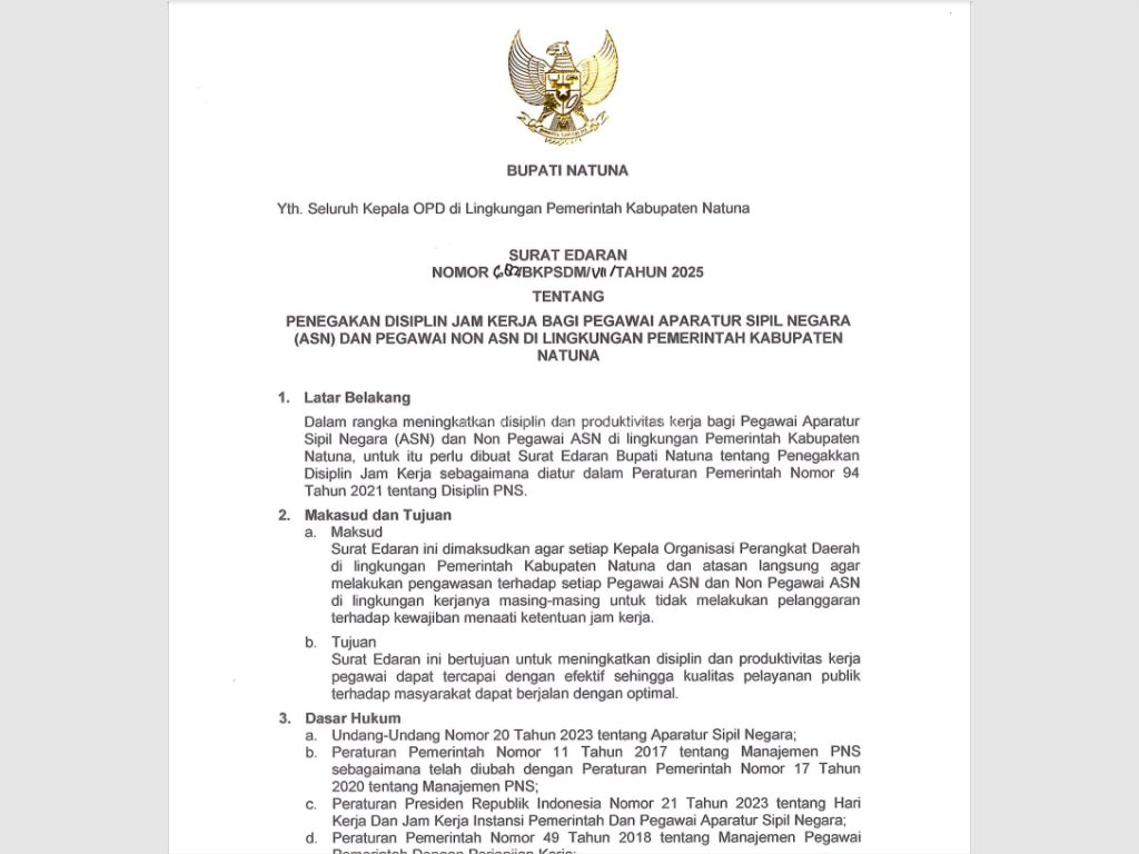 INIKEPRI.COM – Pemerintah Kabupaten Natuna mengambil langkah serius dalam meningkatkan kedisiplinan aparatur sipil negara (ASN) dan pegawai Non-ASN melalui penerbitan Surat Edaran Bupati Nomor: 682/BKPSDM/VII/TAHUN 2025.
