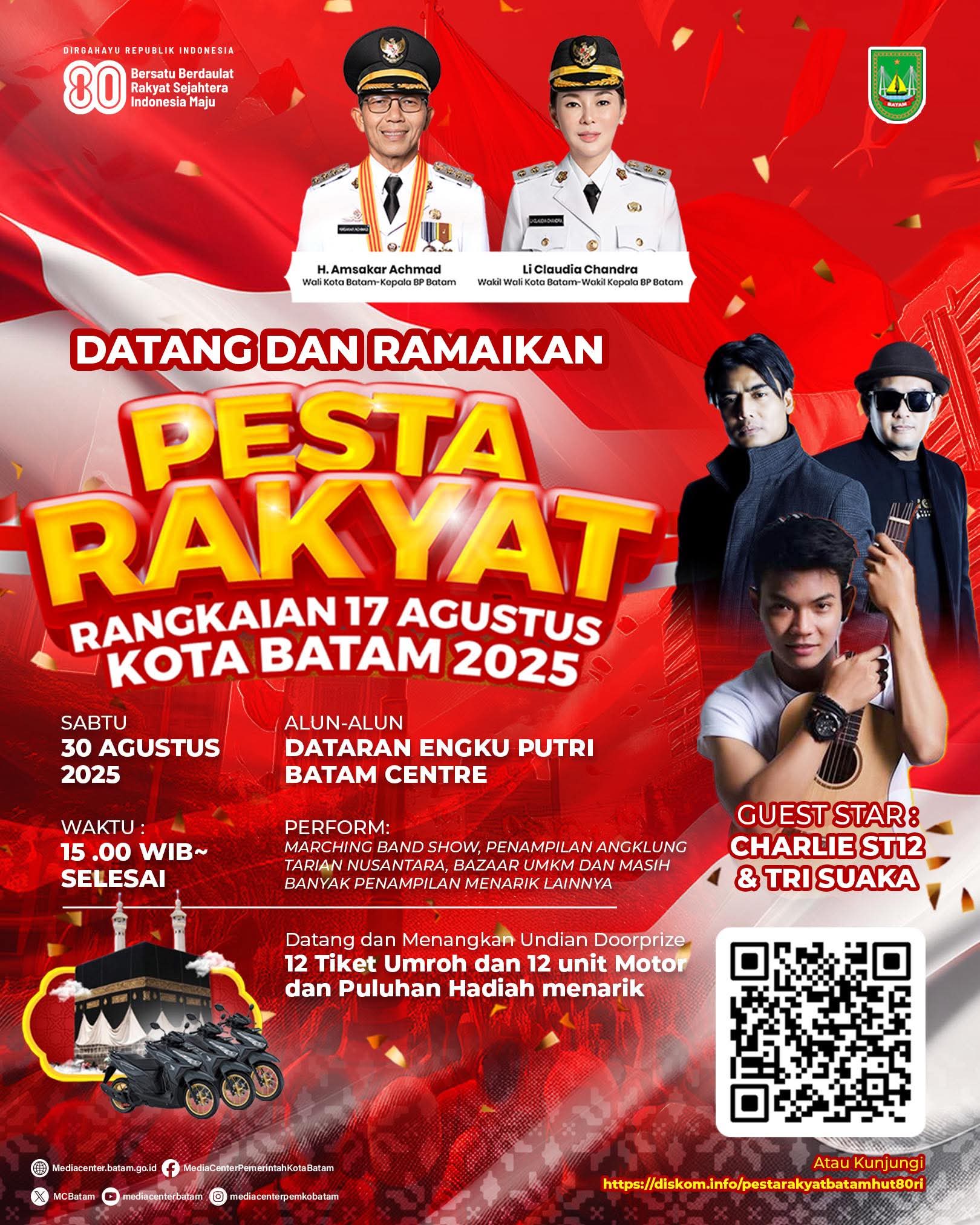 Semua hadiah ini akan diundi pada Pesta Rakyat HUT ke-80 Kemerdekaan RI, Sabtu, 30 Agustus 2025 di Alun-alun Engku Putri Batam Centre.