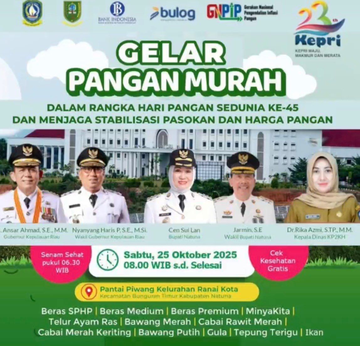 INIKEPRI.COM — Dalam rangka memperingati Hari Pangan Sedunia ke-45 sekaligus menjaga stabilisasi pasokan dan harga pangan, Pemerintah Provinsi Kepulauan Riau bekerja sama dengan Bank Indonesia, Perum Bulog, dan Gerakan Nasional Pengendalian Inflasi Pangan (GNPIP) menggelar kegiatan “Gelar Pangan Murah” di Kabupaten Natuna.