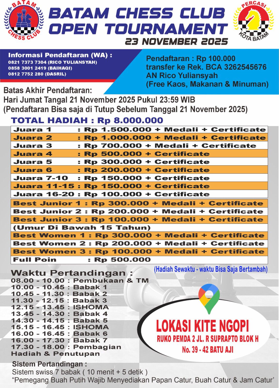 “Insyaa Allah turnamen ini akan diadakan tanggal 23 November di KITE NGOPI Batu Aji dengan total hadiah 8 juta rupiah. Pertandingan akan berlangsung satu hari penuh dengan sistem Swiss 7 babak, 10 menit plus 5 detik,” jelas Rico, Minggu (2/11/2025).