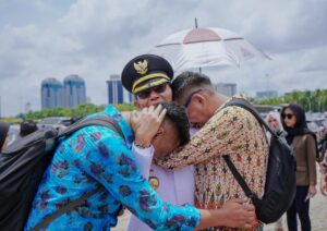 Di tengah keramaian Monas, dua ajudan itu akhirnya melepaskan segala rasa yang tertahan. Ridhian WR dan Syahibul Aziz memeluk Amsakar Achmad, pemimpin yang mereka dampingi sejak masa-masa paling sunyi. Tangis yang pecah itu bukan sekadar haru, melainkan bahasa paling jujur dari perjalanan panjang yang telah mereka lalui bersama. Foto: INIKEPRI.COM