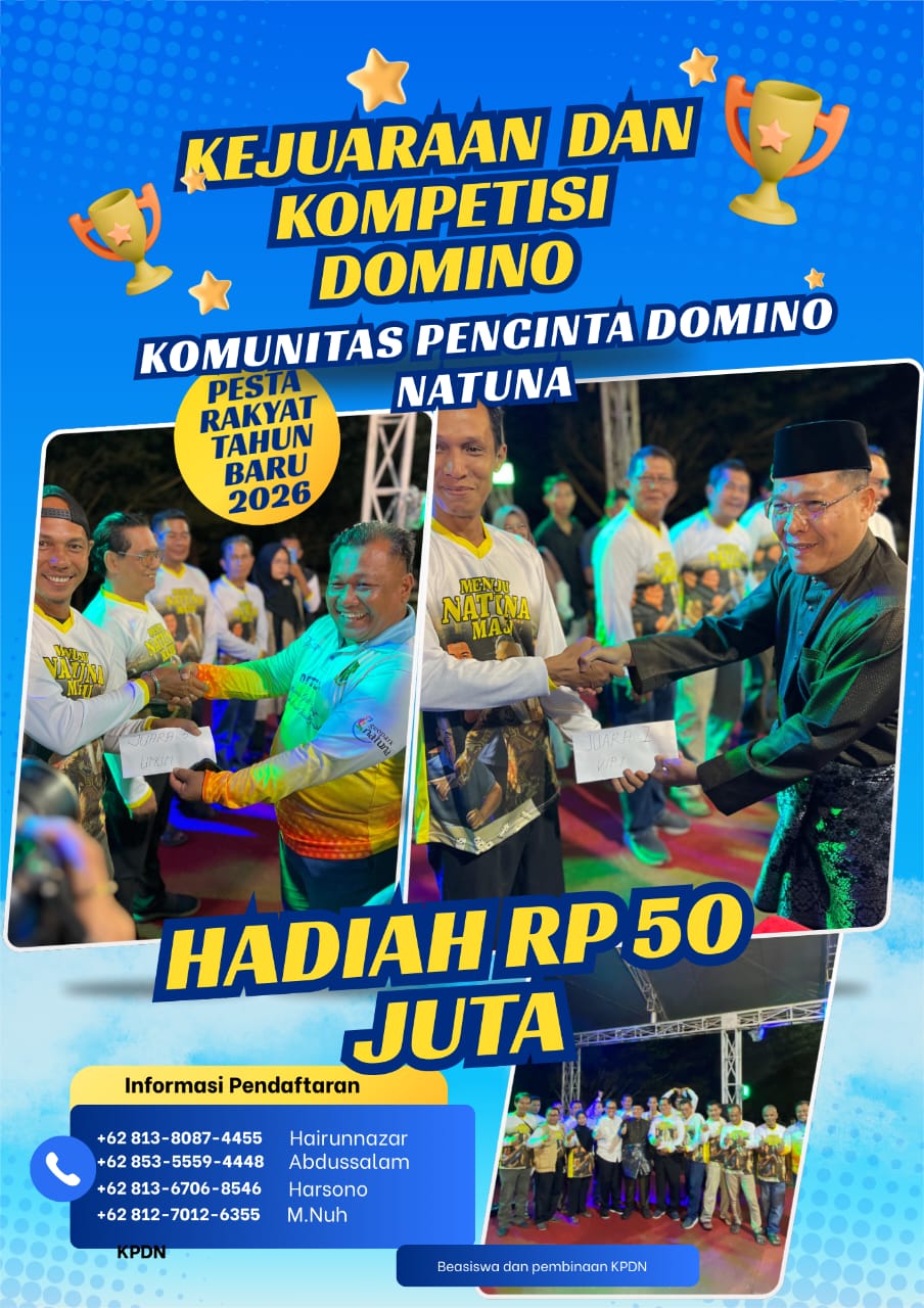 INIKEPRI.COM – Komunitas Pecinta Domino Natuna (KPDN) resmi mengumumkan pelaksanaan Kejuaraan Domino Natuna Tahun Baru 2026, sebuah turnamen besar yang akan memperebutkan total hadiah Rp50 juta dalam bentuk beasiswa pendidikan bagi anak para pemenang.