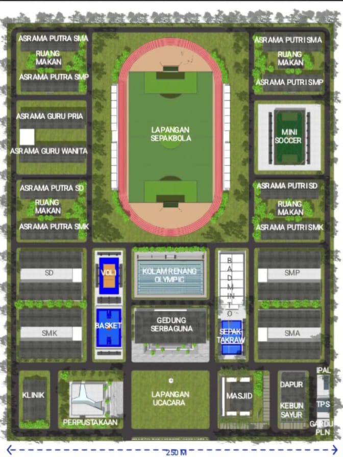 “Fasilitasnya sangat bagus dan lengkap. Selain asrama dan kebutuhan dasar siswa, juga disiapkan sarana olahraga seperti kolam renang standar olimpik, lapangan sepak bola, mini soccer, basket, takraw, voli, dan fasilitas pendukung lainnya,” jelas Iman.